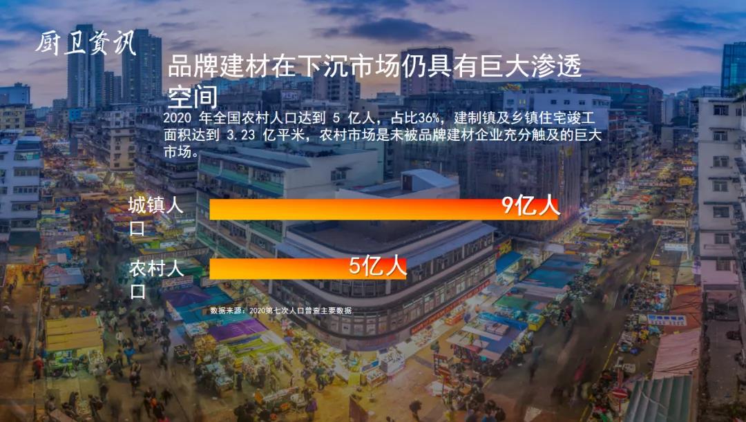 此外,2020 年全國農村人口達到 5.4 億人,占比36%,建制鎮及鄉鎮住宅竣工面積達到 3.23 億平米,農村市場是未被品牌建材企業充分觸及的巨大市場。