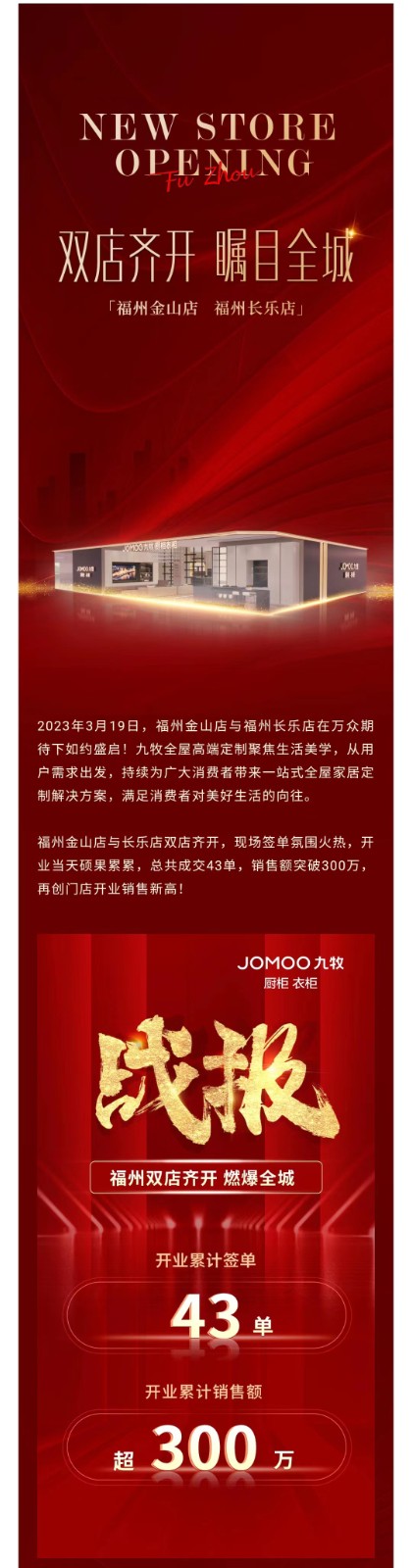 2023年3月19日,福州金山店與福州長樂店在萬眾期待下如約盛啟!九牧全屋高端定制聚焦生活美學,從用戶需求出發,持續為廣大消費者帶來一站式全屋家居定制解決方案,滿足消費者對美好生活的向往。