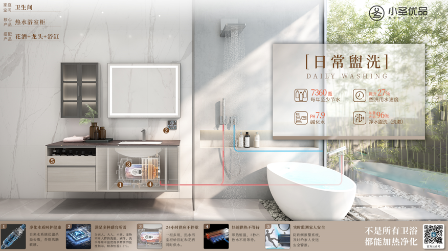 以衛(wèi)浴空間為例,小圣優(yōu)品衛(wèi)浴以熱水浴室柜、熱水花灑、熱凈龍頭核心三劍客為標(biāo)志產(chǎn)品,并開(kāi)發(fā)推出花灑、龍頭、浴室柜、智能馬桶、五金配件等全衛(wèi)產(chǎn)品,以整體熱水空間解決方案,滿足了年輕消費(fèi)者對(duì)健康、智能家庭用水生態(tài)系統(tǒng)與高品質(zhì)生活的雙重需求。