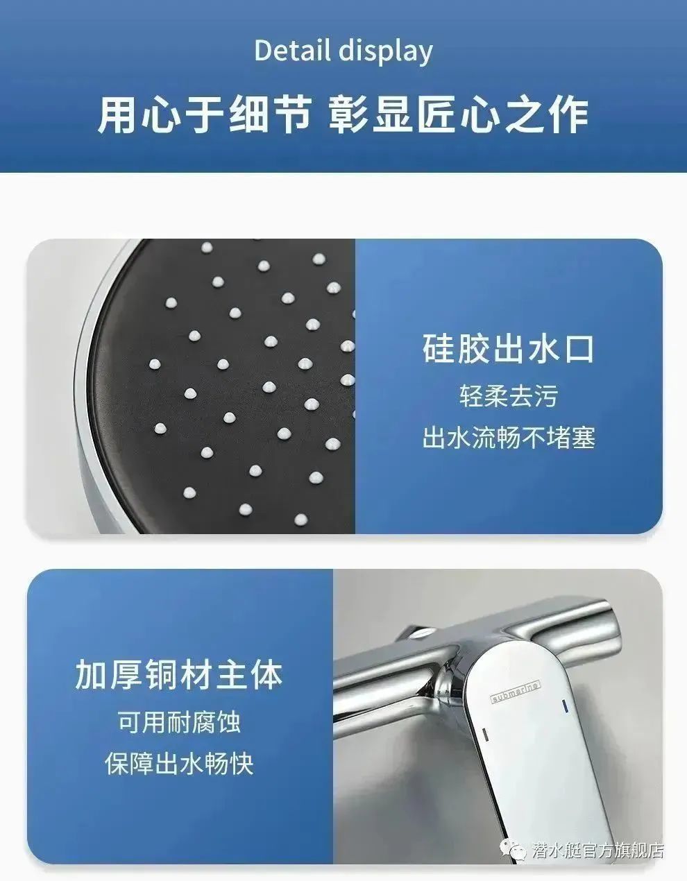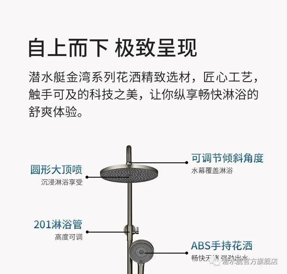 三種潮流色彩相互碰撞, 將簡約與高級融入設計, 演繹著時髦的簡約生活。 潛水艇花灑主體采用加厚銅材, 手感厚重,壁厚均勻,品質看得見。 用心打造的每個細節(jié),用起來更有保障。 三擋模式出水,如同頂噴般的奢華。 水流覆蓋面積更大,出水均勻密集, 讓淋浴體驗更加舒適。 高度角度自由調整,讓您淋浴更暢快 一鍵四控,隨心切換。 潛水艇金灣系列花灑,就像雕塑藝術品一樣裝飾著浴室,為浴室增添一股活潑愉悅的氛圍,這是一種新型藝術表現形式。 谷雨時節(jié),生活就像含苞待放的花朵, 趁著春光無限好,總有夢值得去追, 讓我們踏上新的征程, 帶著春的朝氣和活力, 去追求心中期盼的夢想。 潛水艇衛(wèi)浴, 為您和家人提供和諧快樂的居家時光, 享受溫暖浪漫的居家情懷。