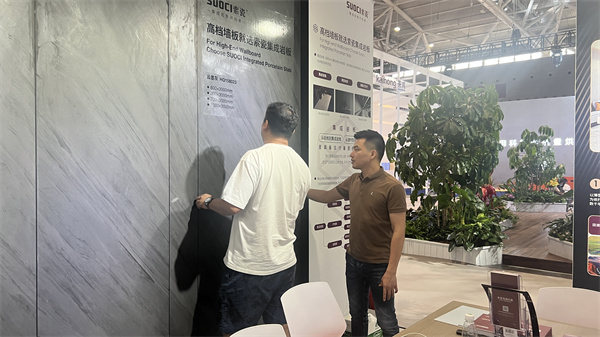 本次展會,索瓷的展位以簡約統一的設計風格,“晨光魚肚白”的背景墻和“云墨灰”的墻面組合,充分呈現出集成巖板的材料美學和創新技術,吸引了眾多協會領導、設計師和客商前來參觀和指導交流。