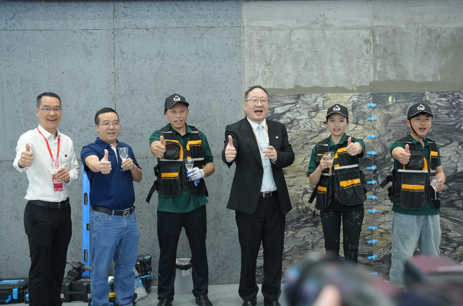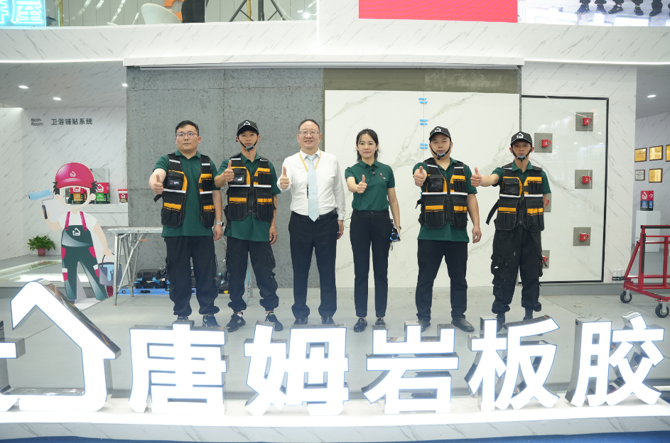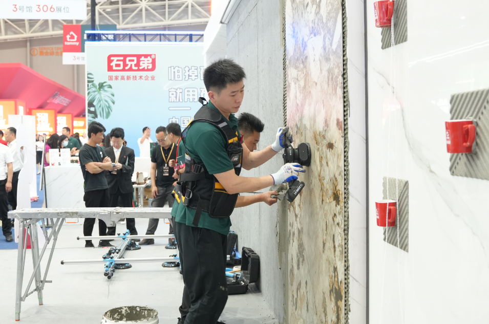 現場的氣氛熱鬧非常,唐姆與新巖素家居、冠珠瓷磚、能強瓷磚、依諾瓷磚品牌、薩米特瓷磚等一線瓷磚品牌、網紅鋪貼團隊三方強勢聯合,“優質的主材+專業的輔材+標準的鋪貼”,進行精彩絕倫的全流程巖板鋪貼演示,吸引了眾多參展商、觀眾前來觀摩、咨詢。