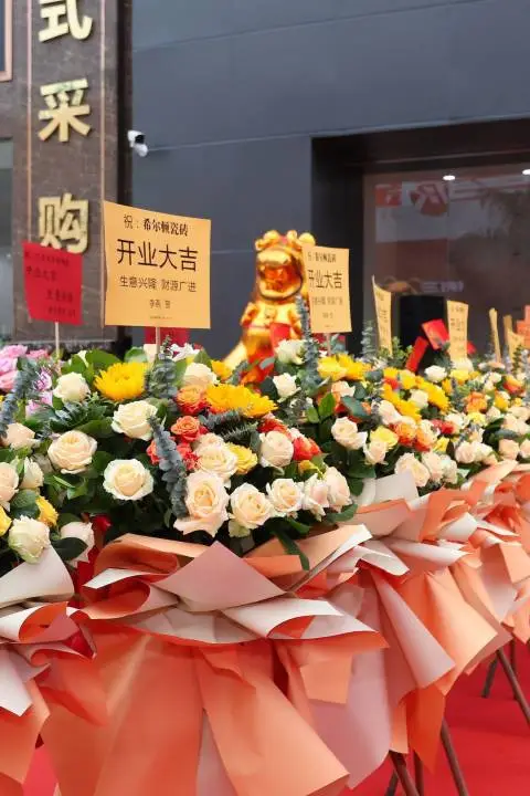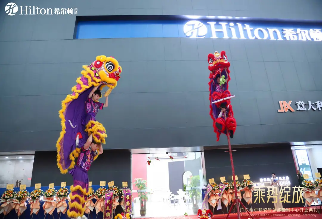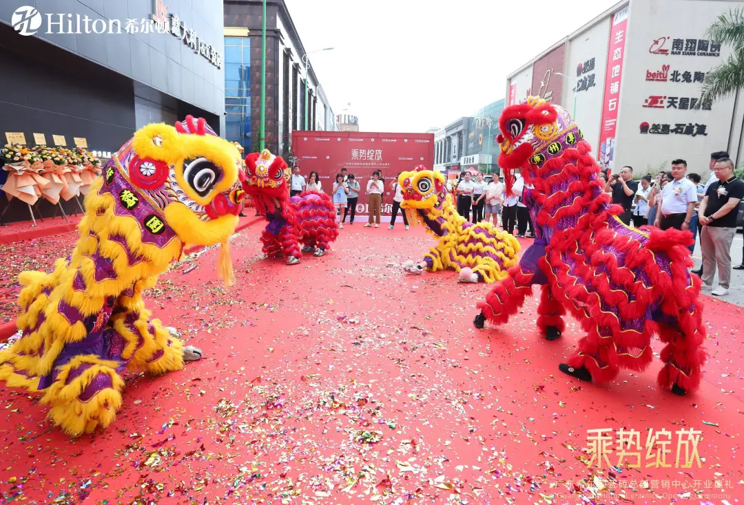 慶典之日,鑼鼓震天響,醒獅獻吉祥。花籃盛放,彩帶飄揚,歡聲笑語匯成一片歡樂的海洋。現場布置熱烈喜慶,處處洋溢著濃厚的節日氛圍。領導嘉賓與客戶紛至沓來,共襄盛舉,紛紛簽到留念,共同祝愿希爾頓瓷磚展廳開業大吉、財源廣進、宏圖大展,邁向更加輝煌的明天!
