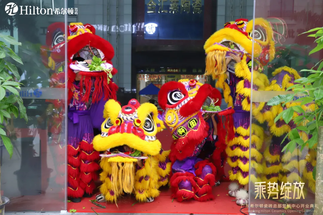 接下來,希爾頓董事長劉志豪和新豪企業董事長劉洪民共同為醒獅進行點睛采青儀式。在這莊重而神圣的時刻,采青不僅寓意著生意的紅火與興旺,生菜更是“生財”的象征。當翠綠的生菜輕輕落地,仿佛福澤降臨,寓意著“落地生財”,預示著財富如泉涌,源源不斷。愿那威武騰飛的祥獅為希爾頓瓷磚帶來吉祥與好運,讓希爾頓瓷磚蒸蒸日上,財源廣進。