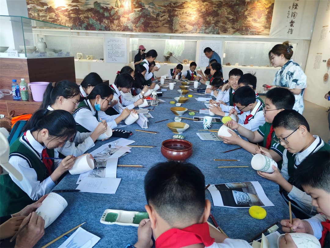 在活動開始之前,同學(xué)們先認(rèn)真完成了陶藝王老師布置的前參作業(yè),對井陘窯資料收集、學(xué)習(xí),帶著問題和思考去活動。在井陘窯工作人員的帶領(lǐng)和全程指導(dǎo)下,同學(xué)們聽講座+參觀+親自動手體驗學(xué)習(xí)、結(jié)合在學(xué)校陶藝課上所學(xué)的知識,同學(xué)們對陶瓷藝術(shù)更加著迷,多方位一體,深度研學(xué),通過實物標(biāo)本,同學(xué)們看到古代制瓷工匠,在選料、淘練、拉坯、修坯、配釉、施釉、裝飾、匣缽、燒裝、狀態(tài)和燒成等,可以清晰得看見瓷器燒造的全流程。同學(xué)們在參觀中學(xué),在動手中領(lǐng)悟,零距離感受手藝人的匠心。在動手體驗實踐環(huán)節(jié),同學(xué)們興致勃勃,沉浸式體驗釉下彩繪和拉坯陶藝技法,惟妙惟肖、栩栩如生的一個個作品在同學(xué)們手中誕生了,