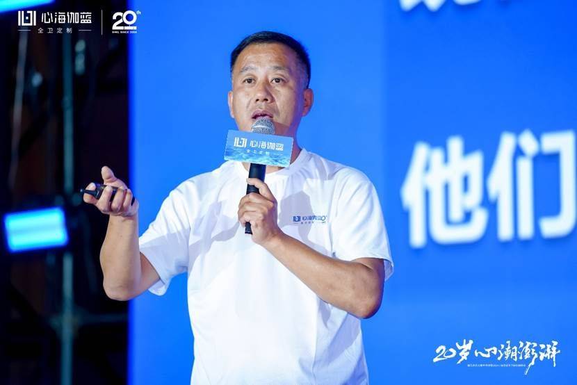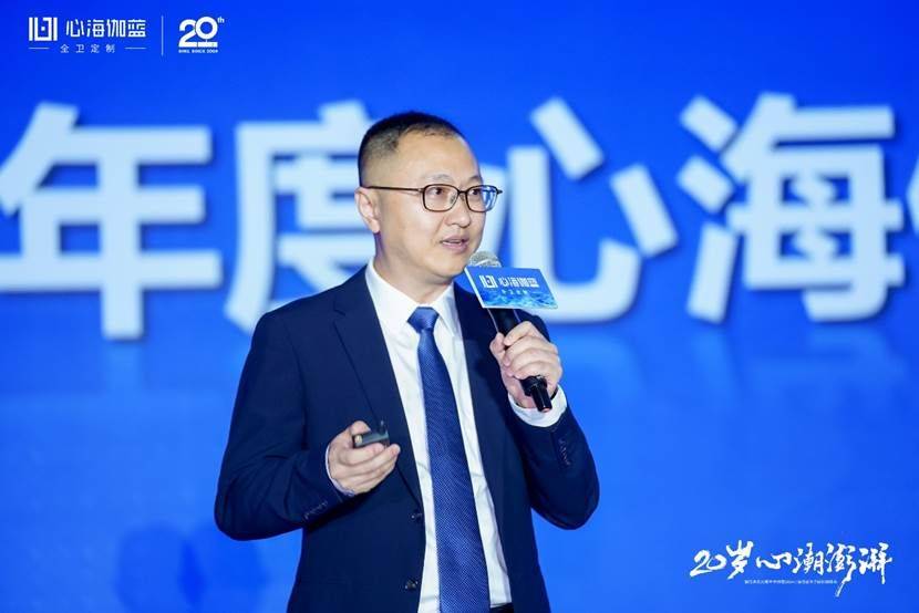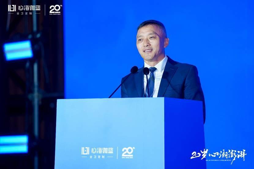 晚宴開始,張愛民董事長在閃耀燈光中登場,熱情洋溢地發(fā)表了20周年報告。張董真情流露地回顧了公司20年的發(fā)展歷程,從幾個人的從浴室柜單一品類的獨角獸到全衛(wèi)定制戰(zhàn)略領(lǐng)航,從多品牌運作到贏伽電商、凱庭淋浴房,雅頌衛(wèi)浴等七大分公司/中心集團發(fā)展,從專賣區(qū)到全國百城千家門店、至商業(yè)版圖覆蓋海外,心海伽藍(lán)始終敢為創(chuàng)新、銳意進(jìn)取,從率先扛起數(shù)智化生產(chǎn)大旗開始,心海伽藍(lán)始終堅持開放分享的態(tài)度,與行業(yè)共同成長。