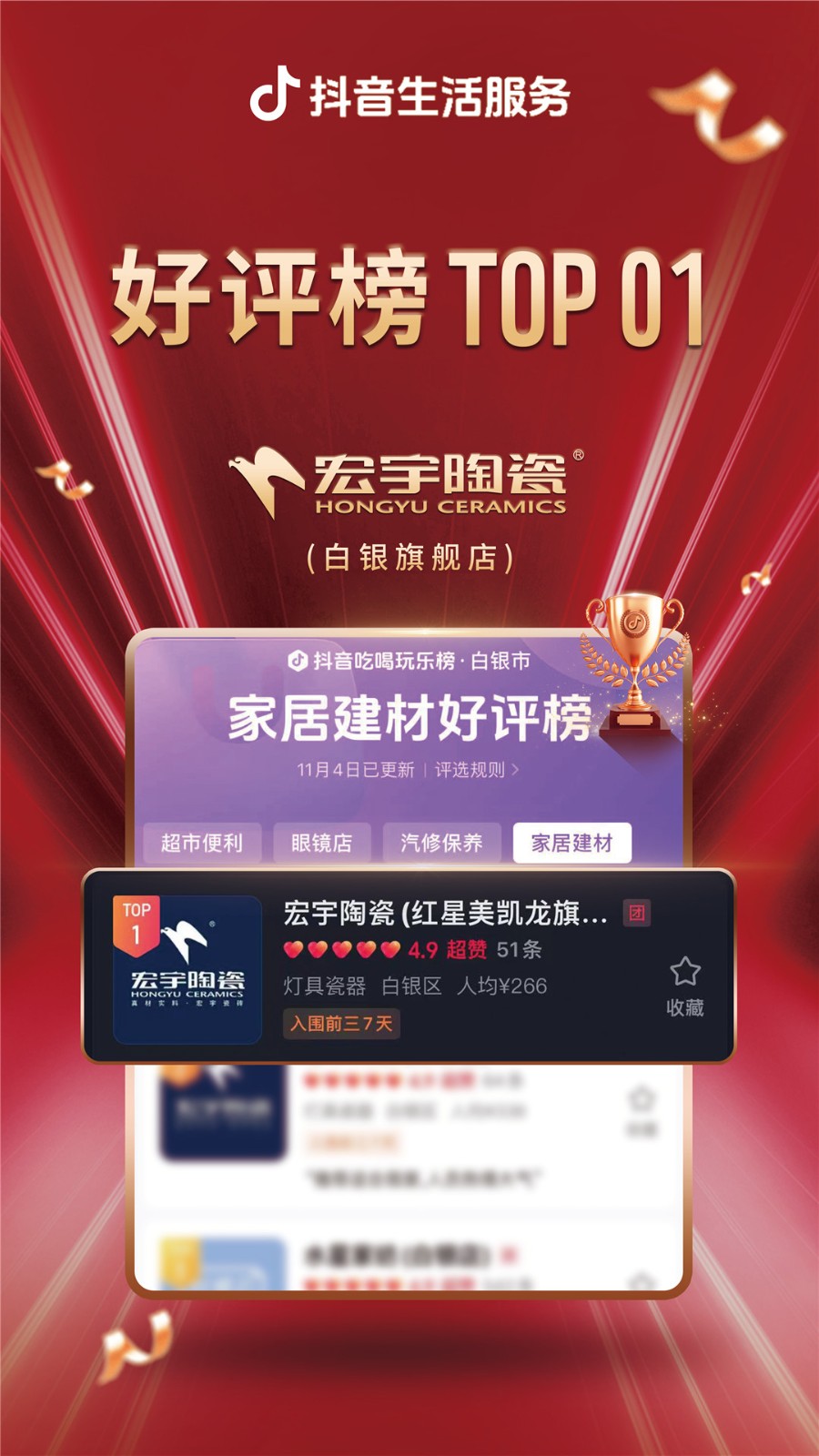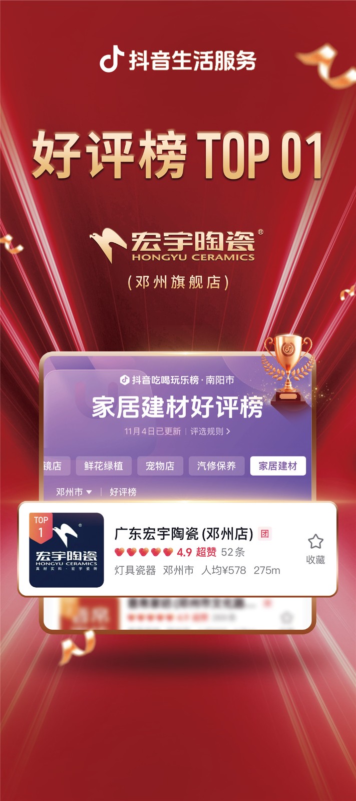 宏宇陶瓷“千城霸榜行動計劃”強勢來襲,席卷全國。雙11狂歡購活動期間,宏宇陶瓷全國多地門店在激烈的市場競爭中持續保持強勁勢頭,一舉奪魁,榮登抖音同城家居建材好評榜榜首,成為眾多消費者信賴的首選品牌。