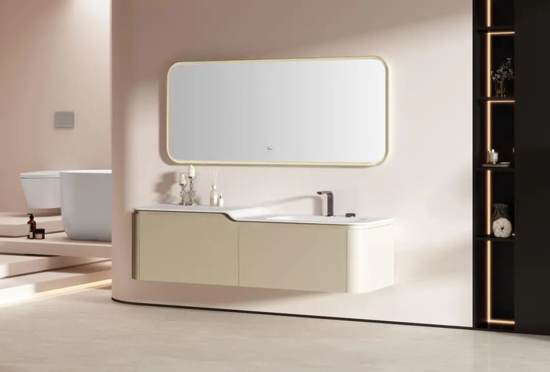 在本次廣交會亮相的【木里定制浴室柜】,創新采用啞光膚感「公爵板」臺面,搭載行業領先的雙色無縫拼接技術,實現臺盆內外差異化配色美學突破。并經國家質檢院權威機構檢測認證榮膺【沸騰質量金獎】,柜體不僅通過25kg重力沖擊測試與4萬次暴力開合極限挑戰,依然毫無破損,穩固如初,而且在防潮性能、環保性能、抗沖擊性能上等評測項中均交出亮眼答卷。