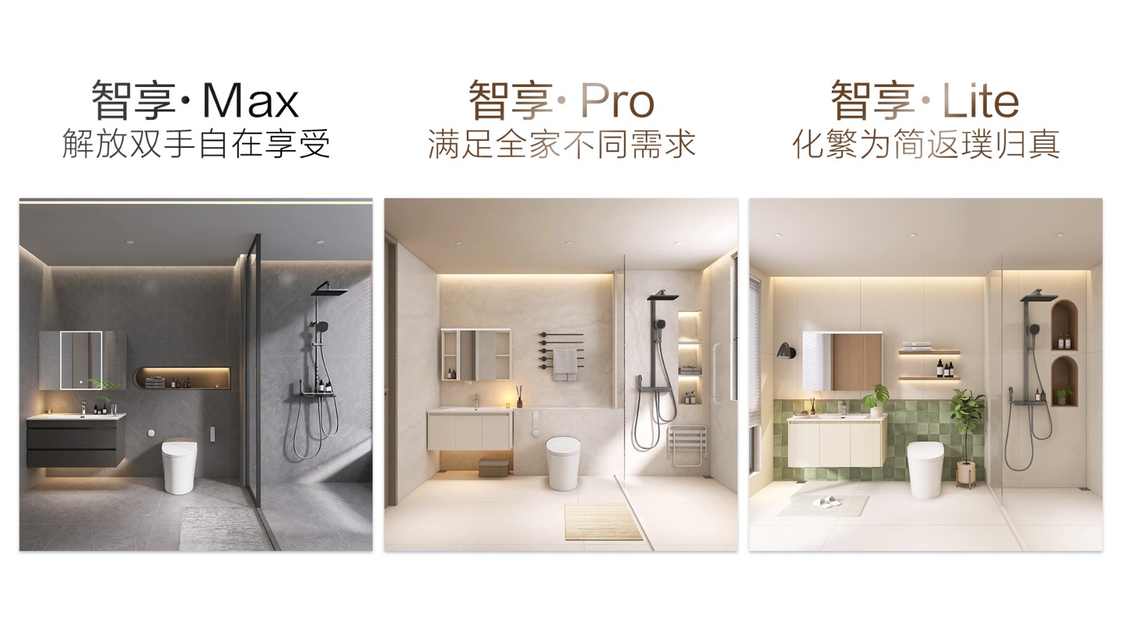 以套系化設(shè)計為核心,重磅推出三大「智」愈空間,以多樣產(chǎn)品組合匹配不同人群需求。套間內(nèi)包含行業(yè)爆款舒沐洗H5Pro智能馬桶、口碑爆款H35Pro的升級力作——全新H36Max智能馬桶、以及HQ606輕智能馬桶,三大單品按需選購,更搭配了高顏值美妝智能鏡柜與鋼琴鍵花灑,實現(xiàn)功能與美學(xué)的雙重升級。
