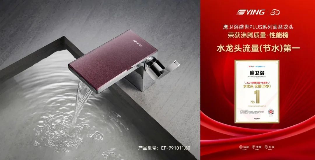 鷹衛浴盛世系列面盆龍頭,創新性地采用寬幅瀑布水設計,通過更寬的出水和清洗范圍,帶來更舒適和潔凈的體驗。在性能上,鷹衛浴盛世系列龍頭在本次沸騰杯參評產品的流量(節水)檢測中排名第一,讓用戶能同時享受舒適體驗和環保節水雙重優勢。